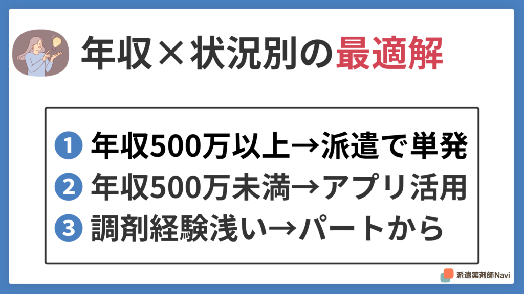 薬剤師免許という強力な資格を持っているからこそ、資格を活かせる場で効率よく稼ぐべきです。