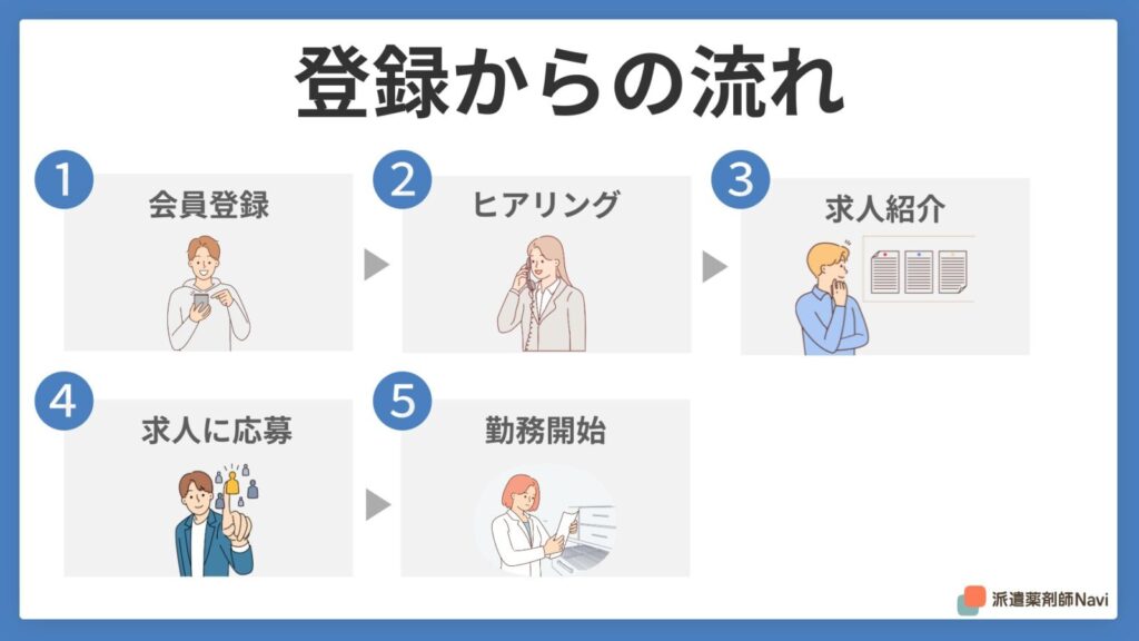 派遣薬剤師として、「ファル・メイト」に登録するところから勤務開始までの流れをご紹介します。